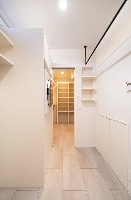 “洗う→干す→しまう”が連動することで家事のストレスが軽減する「家事ラク動線」。水回りからファミリークロークまでつながる動線を確保した、暮らしやすさを意識した間取りです。