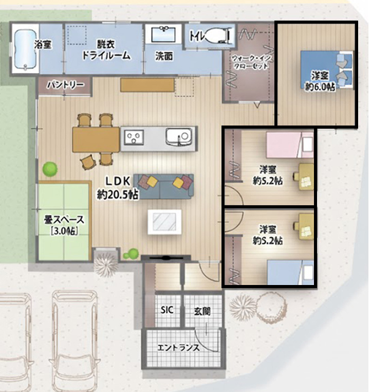 南向きに広がるお庭は、駐車も2台以上可能なゆとりある広さ。家族の思い出を刻むプライベートスペースとして活躍します。